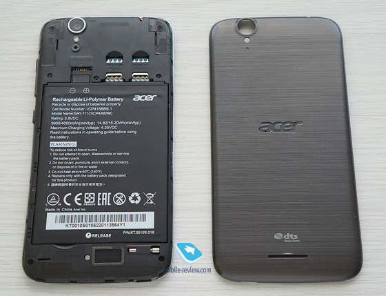 Задняя крышка сделана из матового пластика, однако не такого, как тот, что использовался в Z520 и Z220, где он был похож на что-то среднее между тканью и бумагой. Это обычный пластик, хоть и с приятным фактурным рисунком. Под крышкой спрятались два слота под microSIM, слот для карты памяти и аккумулятор на 4000 мАч!