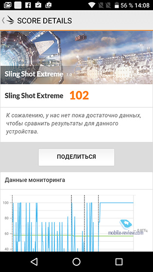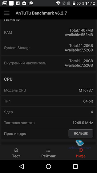 В реальной жизни телефон работает при умеренной нагрузке один световой день (2 часа работы экрана). Сказывается достаточно прожорливый чипсет и не лучший по энергопотреблению экран. Чипсет, память, производительностьУ телефона 16 ГБ встроенной памяти (10.5 ГБ доступно пользователю), карты памяти до 32 ГБ. Оперативной памяти 1.5 ГБ. Чипсет MediaTek MT6737, 4 ядра до 1.2 ГГц, MALI T720MP2. Это не самый производительный чипсет, что и показывают синтетические тесты. Для работы устройства на HD-разрешении его хватает за глаза, так что уверен, что пользователи не будут расстроены тем, что в тестах не получают самые высокие оценки.