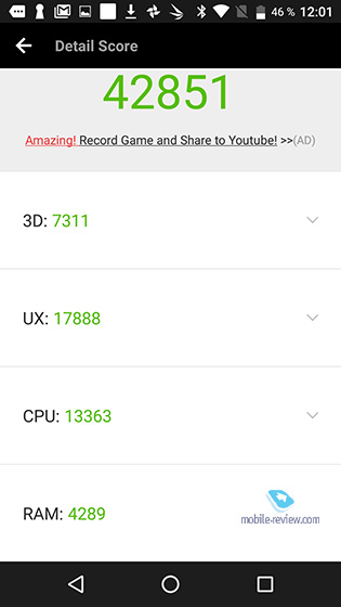 В жизни аппарат показывает неплохой результат, это 3.5-4 часа работы экрана при условии 1.5 часов разговоров в течение дня и передачи данных в 4G. То есть аппарата легко хватает на сутки работы, при меньшей нагрузке он проработает и два дня. В играх эта модель разряжается быстрее: примерно 3.5-4 часа гонок, и телефону пора отправляться на зарядку (но звук при этом хорош!). Большая батарея здесь вовсе не формальность, но чипсет прожорлив, и поэтому получилась серединка на половинку, время работы аппарата во многом будет зависеть от сценария, по которому вы его используете. Для тех, кто ищет рабочую лошадку для переписки, просмотра видео и тому подобного, он отлично подойдет. Память, карты памяти, чипсет, производительностьВ аппарате 3 ГБ оперативной памяти, встроенной 32 ГБ (23 ГБ доступно пользователю), плюс можно установить карты памяти объемом до 128 ГБ. Чипсет MediaTek MT6750T, восьмиядерный процессор (4 ядра до 1.5 ГГц, 4 ядра до 1 ГГц). Это не самое производительное решение, но в интерфейсе вы этого не заметите, синтетические тесты дают следующие результаты. Скорость открытия приложений, системный UI не вызывают вопросов, все достаточно бодро.