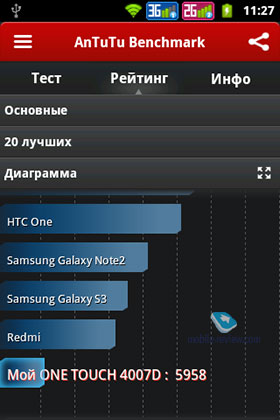 В реальности смартфон с двумя действующими SIM-картами без проблем работает в режиме ожидания больше недели. Если использовать его изредка для звонков (пару раз в день, в качестве второго телефона), время работы также исчисляется днями, в среднем это 3-5 дней, в зависимости от активности. ПроизводительностьСмартфон построен на платформе MTK 6575 с одноядерным процессором частотой 1 ГГц, оснащен 256 МБ оперативной памяти и около 100 МБ памяти для хранения пользовательских данных. Этого объема едва хватит для установки пары программ и игрушек, поэтому, если вы планируете использовать смартфон не только как портативную точку доступа, нужно сразу покупать к нему карту памяти. Скорость работы смартфона далека от хорошей, особенно если сравнивать его с топовыми устройствами. Но можно посмотреть на это с другой стороны. Для телефона за 1 000 рублей производительность более чем адекватная – серьезных лагов и задержек при работе с интерфейсом нет, а паузы в запуске программ для столь слабой начинки вполне естественны, но и их можно пережить.