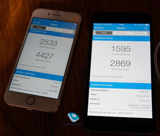 Работа 3D Touch с наклеенным стекломМне показалось важным попробовать такую возможность, многие привыкли защищать дисплей с помощью пленок или стекол - насчет пленок люди из Apple говорили, что проблем с работой не будет, насчет стекла информации не было. После того, как приклеили стекло, для вызова контекстного меню пришлось нажимать чуть сильнее, в настройках 3D Touch был выбран слабый уровень нажатия. Поиграв с настройками, понял, что это оптимальный вариант, если планируете использовать стекло для защиты экрана. Итог простой: пленки и стекла с новым iPhone 6S можно и нужно использовать. Многие журналисты морщатся, когда об этом заходит речь, я же морщиться не буду - потребители используют «айфоны» порой несколько лет кряду, на рынке есть хорошие пленки, так почему бы и не защитить экран? Потом будет проще продать, да и олеофобное покрытие будет как новое. ПроизводительностьИспользуется новый процессор A9 c 64-битной архитектурой, работает в паре с сопроцессором M9. С помощью бенчмарка провели измерения, результаты на скриншотах. Наблюдения из жизни просты, 6S работает гораздо быстрее предшественника - поначалу это не особо заметно, но затем видно очень хорошо. Быстрее открываются сайты, быстрее отрисовывается карта, приложения запускаются быстрее.