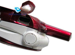 No elements are placed on the right side, and the left one hold a charger connector (a headset is also connected to it) closed with a plastic cover fixed to the body. The shutter happens to be a part of the body, so, having lost it, you'll significantly spoil the appearance. A camera button is placed a bit lower. During a conversation it is responsible for a dictaphone work. And a volume button is placed lower.