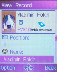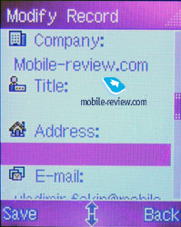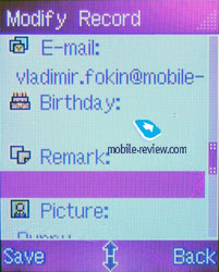 Accessing the main menu is possible by pressing a left functional key from the standby mode. Also when in the standby mode you press one of the sides of the navi button, you call one of the functions. Unfortunately, you can't reassign access to this or that item. Pressing "Ok" in the same mode you will clear the display and leave only a background image. Localization is carried out not very well, there are no abbreviations, the names of the items that are too long for the screen are shown in a creeping line, but there are many words translated incorrectly. We'll hope this disadvantage will soon be corrected. Phonebook. Up to 300 contacts can be stored in the phone's memory; you can store a name, 4 phone numbers, a fax number, a company name, a short text note, address, e-mail address for a contact. Besides, you can point out the caller's birthdate, gender, assign a picture or a photo (shot in a portrait mode only), record a voice mark, assign a call melody and an indicator colour, and correlate a user with one of the groups.