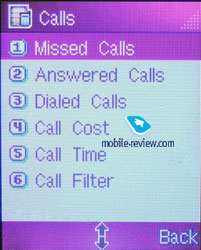 Calls. This section holds lists of incoming, outgoing and missed calls, and call duration counters are also here. Also here is a call filter containing a black and white lists with up to 10 numbers in each (for the black list - nine numbers are one unknown call), each list is easy to adjust.