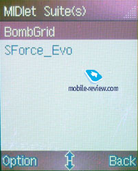 Java. This section holds Java applications, the device supports J2ME (CLDC+ MIDP1.0.3). By default two games are preinstalled, they are Bomb Grid (game for logic) and S Force Evo (arcade). About 500 KB are provided for Java applications.