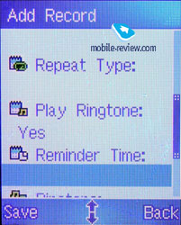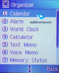 Organizer. The calendar can show the whole month or a list of all the events. When having a monthly view, the sign of the zodiac that the date falls under is shown on the top, and a week number is shown below. For an event you can set a name, an entry type, start and end time, repetition is chosen (once, daily, weekly, monthly, and annually); a reminder with the time to snap into action is set. Besides, a call melody can be set and a short text note can be entered. Also holidays are entered; date and a tip are kept for them. The phone holds up to 100 events and 30 holidays.