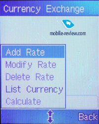Voice recognition. Here you can enter up to 10 voice marks for voice dialing and up to 10 voice commands for fast access to the necessary phone functions. The function is realized rather well, voice is recognized with no problems. To use voice dialing you need only to hold the camera button in an open mode. This section holds world time function, a plain calculator, currency converter and a stopwatch with intermediate values.