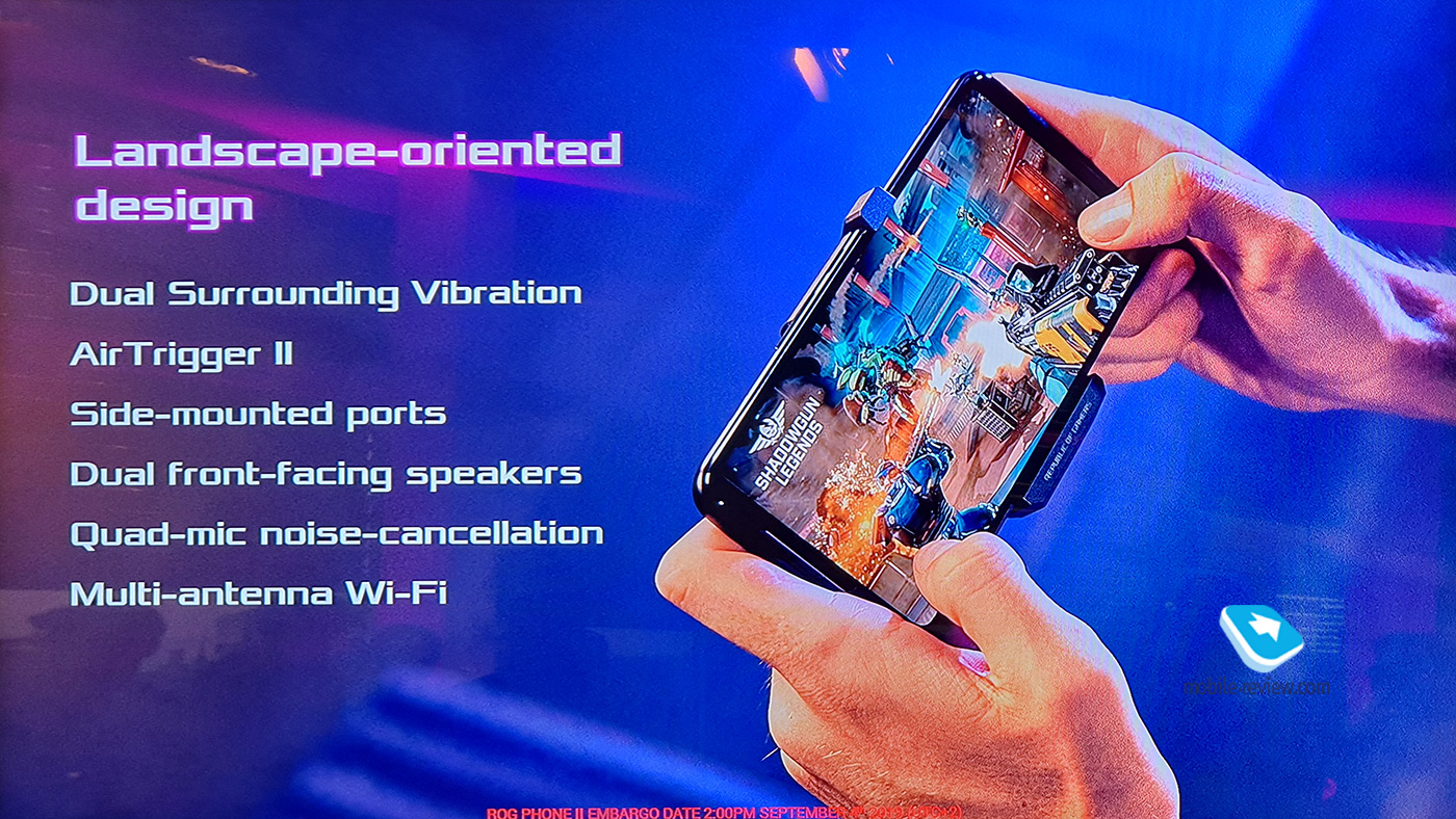 Вся конструкция смартфона заточена под игры, под то, что человек будет держать его в альбомной ориентации. Например, стереодинамики смотрят на игрока, и руки их не прикрывают. Также вибромоторчиков несколько, чтобы руки чувствовали дрожь во время игры. Даже конструкция Wi-Fi-антенны сделана так, чтобы при таком хвате ничто не мешало сигналу.