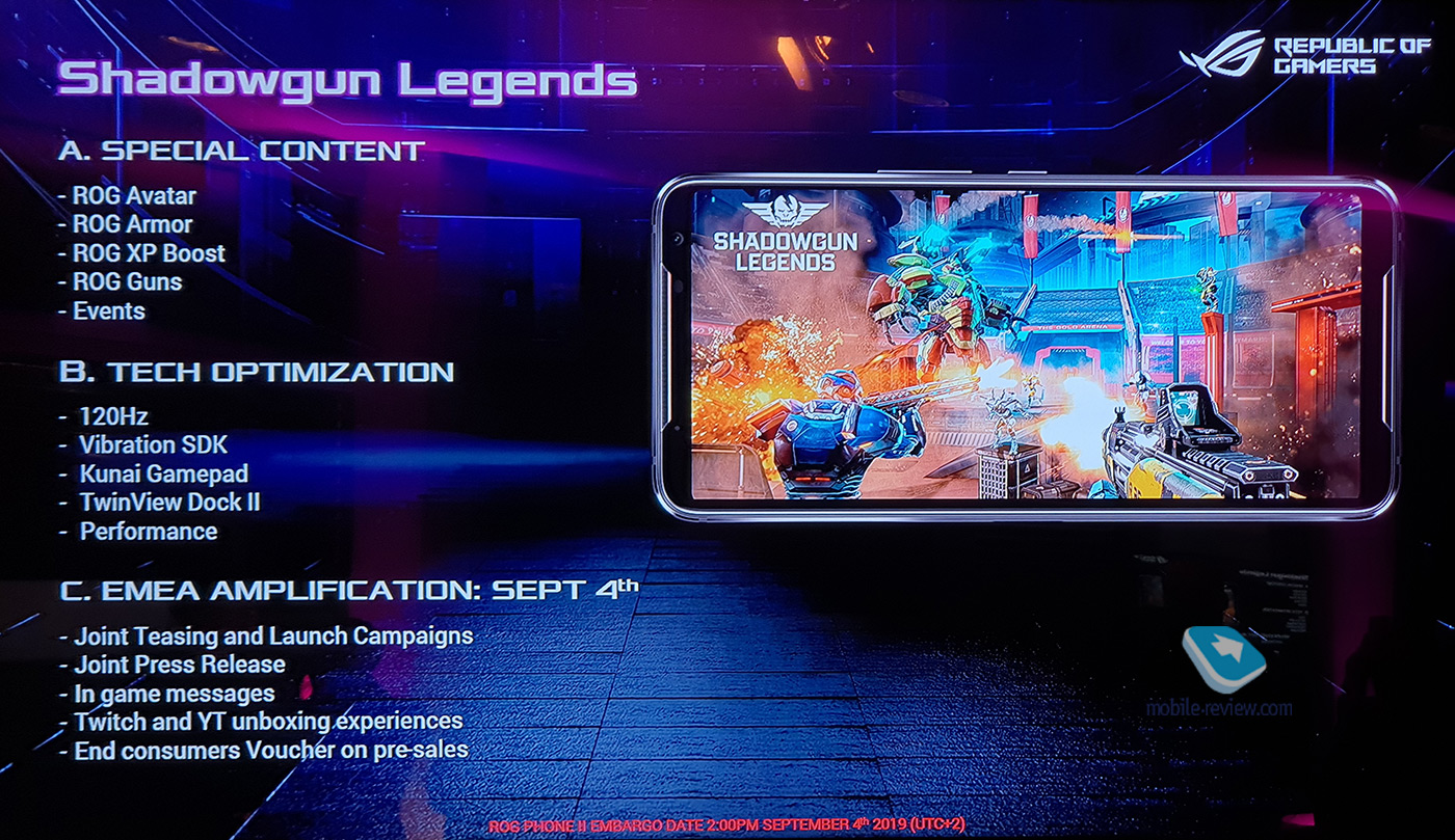 Первый взгляд на смартфон для геймеров – Asus ROG Phone IIПривет. Продолжается наш забег по Берлину и новинкам, которые приходят на европейский рынок. В Китае ROG Phone II уже продается с середины июля, причем в аспекте PR тут все типично – два миллиона предзаказов, не стыдно блеснуть цифрой. Да и другие маркетинговые изыски в русле современных тенденций – первая партия в 10 тысяч штук была продана за 73 секунды. Ох уж эта неискоренимая тяга к красивым цифрам. По факту в Китае было несколько распродаж, и есть ощущение, что каждый раз партия составляла те самые десять тысяч штук. И это очень неплохой показатель для смартфона, что стоит примерно от тысячи долларов в базовой версии (есть варианты и за 500 долларов, но это скорее исключение, базовая версия является основной и ключевой).