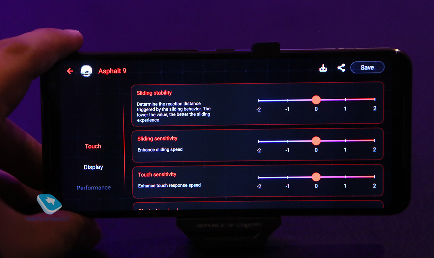 И в таких «мелочах» проявляется то, что Asus знает об игроках. Это удовлетворение потребностей (мнимых или реальных, не так уж и важно), что появились на рынке ПК, и их просто перенесли в смартфоны. Мне этим продукт нравится, он рассчитан на очень узкую нишу, но отсюда его уникальность. Что любят игроки? Не поверите, они любят, чтобы клавиатура переливалась, обыгрывались логотипы. И в этом смартфоне это все есть в полной мере, все аксессуары имеют лого ROG либо надпись, и они обязательно будут переливаться так, как захотите вы. Но и это еще не все – отдельное приложение для контроля всех настроек, от экрана до звука и управления сетью.