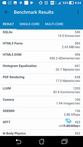 В целом, впечатления от камеры несколько противоречивые. Порой она выдает весьма приличные для бюджетного сегмента снимки c хорошей детализацией и цветопередачей. А порой вдруг начинает капризничать, что приводит к неверной фокусировке или смазанным кадрам. Оценить качество камеры вы можете по тестовым снимкам ниже. Хочу специально отметить, что погода последнее время стояла отвратительная и фотографии были сделаны в пасмурные дни. То есть, условия съемки были изначально крайне далеки от идеальных. Беспроводные интерфейсыЗдесь никаких приятных сюрпризов смартфон не преподносит, все стандартно для бюджетного сегмента. Основные беспроводные интерфейсы – Wi-Fi 801.11 b/g/n 2.4 ГГц и Bluetooth 4.0. Поддержки Wi-Fi 802.11ac и NFC ожидаемо нет. Навигация представлена поддержкой GPS и Глонасс, китайская BeiDou отсутствует. Поддержка LTE ограничена LTE-A Cat. 4 (скорость до 150 Мбит/с), FDD-LTE Bands 1, 2, 3, 5, 7, 8, 20. ПроизводительностьСердцем смартфона выступает MediaTek MT6737T – бюджетный 64-битный чипсет, выполненный по 28-нанометровому техпроцессу. В его состав входят четырехъядерный процессор (4 ядра ARM Cortex-A53 с частотой 1,44 ГГц) и графический ускоритель Mali-T720. Объем оперативной памяти зависит от версии смартфона, в моем аппарате установлено 2 ГБ. Производительности хватает для повседневных задач, но играть в современные 3D игры на максимальных настройках вряд ли получится. Да и в целом MT6737 – далеко не самое производительное решение в своей категории. Результаты синтетических тестов достаточно скромные: