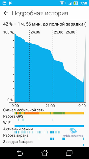 Итог: смартфон проработал около трех суток, после чего у него осталось еще 28% заряда. По уверениям системы, этого хватило бы еще на сутки работы. Общее время включенного экрана составило 5 часов 40 минут. «Стандартный» режим использования: