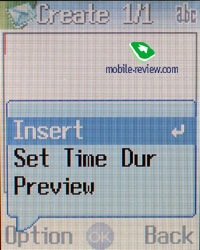 A simple in use MMS editor allows creating up to 6 slides. The message sent can't exceed 96 KB.