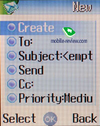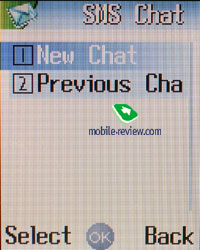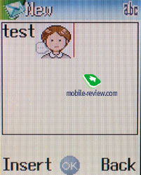 At an incoming call a caller's photo (video) is shown full screen (if the number is included into the phonebook). Messages. Up to 1000 messages can be saved into the phone's memory. The device allows working with EMS, and there is a preset of small pictures, animations and melodies. Also there is a set of templates with an editing capability. You can send our message to a single user or apply a group message capability. SMS chat similar the one in Sony Ericsson's phones is also here. You enter your nickname and the called person's name, further all the new messages will be displayed in a single window.