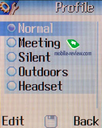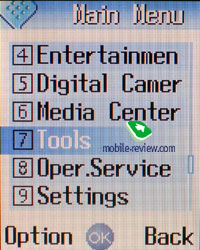 A call playing loudspeaker is on the back. The rest is taken by a 700 mAh Li-Ion battery. As the manufacturer claims, it allows about 180 hours of standby time and up to 3 hours in the talk mode. About 3 days the device worked in Moscow in case of 15 minutes of talks and up to 20 minutes of other functions a day. Full recharging will take about 2 hours. MenuThe main menu is shown in two versions - the first is three rows of icons with a selected item highlighted, and an explicative tip below. The second way is quite original - you see a list with only names of items and numbers for fast access. Then you might find it hard to orientate yourself, since it seems you are in a submenu, which is displayed the same way. Of course, the first version is more attractive - the icons are well drawn and no slowing down appear when transferring from one item to another. The second way will be appropriate for those used to dealing with number sequences, fortunately, supported here. You can switch these views both from the settings menu and in the main one pressing the left functional key.