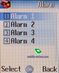 Applications. An alarm clock is here, and totally there are four of them. Fro each you can change a melody, turn the vibra on and off, repetition can be set from 1 to 5 and a working interval from 1to 20 minutes. Besides, the alarm clock can be set for once, constant or every week-day work.