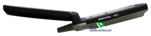 A coupled volume button is placed on the left side surface, being small and placed uncomfortably, you'll have to search for it, since your finger won't cover it at a conversation. A camera button is placed a bit below. The very top features a headset connector closed with a rubber cover fixed to the body. An interesting place for a strap hole is chosen - it is on the left side surface between a headset connector and a volume button. The only IrDA gap stands on the right surface. Traditionally interface connector is placed on the bottom.