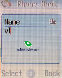 The localization is good - we found no abbreviations, long names are shown in a creeping line. The exact font is black and quite large to read the texts with no problems. The only point is when selecting an item the font gets white and if the name is long enough, the end of the line interflows with the background (at any colour scheme), but it hinders navigation in no way. iTap predictive input is provided. There are 20 MB of memory with 16 of them available for keeping images and video. Phonebook. The device allows up to 500 numbers in the main memory. Each user can have a name, up to 3 numbers assigned, e-mail address and a text note (about 32 characters). Besides, you can assign a contact to one of several groups, set a call melody and a picture (photo) or video shown at incoming call. Search is possible by either the first letter when displaying the whole list or a name. Contacts from both internal and SIM memory are shown altogether.