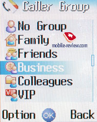 В телефоне есть 6 групп, для каждой можно задать мелодию звонка и установить картинку из доступных в аппарате, кроме этого, возможно изменить имя группы. Есть и быстрый набор до 9 номеров.