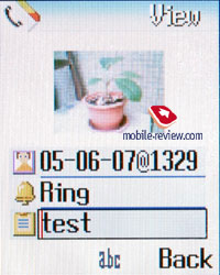 На верхней крышке находится небольшой cSTN дисплей разрешением 94х64 точки (20х13 мм) способный отображать 4096 цветов. Информация на нем читается не очень хорошо, сказывается мелкий шрифт, а также его цвет, здесь он не черный как обычно, а зависит от установленной цветовой схемы (лучше всего читается синий шрифт). Если номер вызывающего абонента еще можно как-то увидеть, то чтение SMS превращается в пытку (для некоторых цветов), проще открыть аппарат и прочитать сообщение на внутреннем дисплее. Кроме этого, дисплей может выступать в качестве видоискателя при фотосъемке автопортрета, правда, все это, можно сказать, делается на ощупь, но большего в этом режиме и не надо, самое главное хоть что-то увидеть. Также на дисплее можно просмотреть календарь со списком дел (отображается на месяц). Если бы не шрифты (здесь сказывается и их размер, и цвет), то внешний дисплей был бы очень полезен, а так некоторым пользователям придется вообще отказаться от его использование в пользу внутреннего дисплея. Кроме этого стоит обратить внимание и на то, что при открытии телефона внешний дисплей не отключается, а продолжает работать и на нем отображается название компании. Это конечно красиво, но вот на энергопотребление, сказывается негативно.