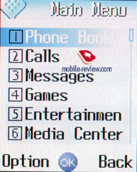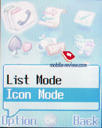 На российский рынок телефон будет поставляться только в комплектации с батареей емкостью 650 мАч. В некоторых других странах в стандартной комплектации будет доступна батарея емкостью 1000 мАч. МенюГлавное меню аппарата представлено в двух вариантах, первый это три ряда иконок, выбранный пункт подсвечивается, а внизу отображается поясняющая надпись. Второй вариант довольно оригинальный, это отображение вертикальным списком, то есть только название меню и номер для быстрого доступа. В этом случае, в главном меню сложнее ориентироваться, так как постоянно возникает ощущение, что находишься в подменю, которое отображается точно также. Первый вариант, конечно, более привлекателен - иконки прорисованы хорошо, видимых притормаживаний при переходе между пунктами нет. Второй вариант больше подойдет для тех, кто привык перемещаться по меню с помощью цифровых последовательностей, которые здесь поддерживаются. Переключение между этими двумя вариантами возможно как из меню настроек, так и в самом главном меню, при нажатии на левую функциональную клавишу.