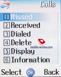 Журнал вызовов. Здесь хранится информация о входящих, исходящих и пропущенных вызовах, до 30 номеров в каждом разделе. В списках можно посмотреть только имя или номер, информация о дате и времени звонка отсутствует. Звонки с одинаковых номеров не объединяются, но особого смысла в отсутствии информации о времени звонка в этом нет. Здесь же находятся счетчики времени разговора.