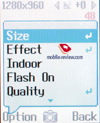Камера, установленная в аппарате 1.3 мегапикселя, в качестве видоискателя может выступать как внешний, так и внутренний дисплей. На внутреннем дисплее в режиме съемки отображается информация о разрешении, настройки контрастности и зума. Отклонение навигационной клавиши вправо/влево позволяет настроить контрастность, а вверх/низ функцию зум. Нажатие левой функциональной клавиши открывает доступ к основным настройкам камеры. Возможно выбрать следующее разрешение снимков: 96х64, 128х128, 128х160, 640х480 и 1280х960. Также имеется 11 эффектов, все фото с эффектами в одном архиве 2.73 Мб. В аппарате есть 8 кратный цифровой зум (zip архив 1.53 Мб).