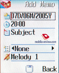 Просмотр календаря возможен только за месяц или списком событий. Для каждого события устанавливается дата и время, можно записать тему, выбрать вариант оповещения (звонок, вибро, звонок и вибро) и мелодию звонка. Кроме этого, возможно добавить текстовую заметку и установить повторение - по будням, каждую неделю, месяц.