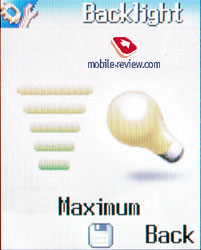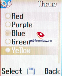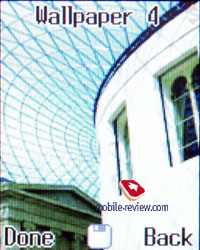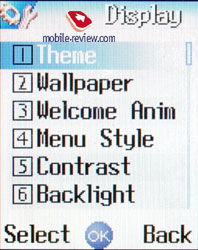 Для дисплея предлагается выбрать одну из пяти цветовых схем, установить картинку в качестве фона (5 для внешнего дисплея и 5 для внутреннего). Кроме этого, можно настроить контрастность (5 уровней) и яркость подсветки (5 уровней), а также выбрать время подсветки от 8 до 30 секунд, либо установить на постоянную работу (для тех, кто любит играть в игры).