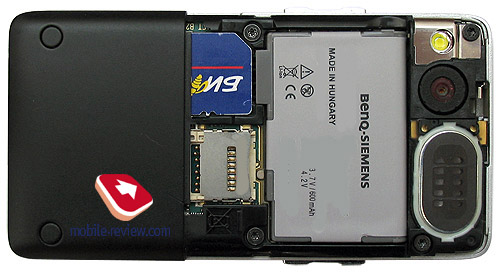 The battery applied to this model is Li-Ion with the capacity of 600 mAh and reminds of a small chocolate bar to some extent. Considering the fact the platform this device is built on is similar to Siemens S75, where the battery has the characteristic of 820 mAh, we did not cherish hopes for outstanding life time, as apart from different index the reviewed handset has a better display and loudspeaker incorporated. The manufacturers claims 300 hours of life time in standby and up to 5 hours of talk time. Though in practice, the charge lasted for approximately 15 hours with 45 minutes of conversations and 20 minutes of other functions usage. In other words the phone requires charging every evening. It can be good for about 2 days with 45 minutes of talk time alone. Anyway, in Europe our results are more likely to be extended by 20-205 percents owing to higher density of base stations and better coverage. In Germany, for example, two days of stable operation will look quite normal if you spent about 30 minutes on conversations a day. Yet the average life time is rather poor and significantly differs for the worse from all the products introduced on the market. That’s a factor you should keep in mind while considering this phone as your future mobile device. Full recharge time of the battery is almost 2 hours