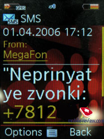 Messaging. Three types of messages can be created – SMS, MMS and E-mail. When you are creating SMS messages, you can type long compositions since joined message system is supported, maximal length is 755 symbols of latin font and up to 330 for cyrilics. Extended modes are not supported; you can only insert text template or contact from the phone book. T9 dictionary without word auto match function is supported. The words that are not present in the database can be saved afterwards. Next time they will be used, and basically they get easily recognized. Traditionally, this phone supports text line the letters for the button you are pressing, however another tradition was kept as well, and Russian letters do not match the common layout for most phones.