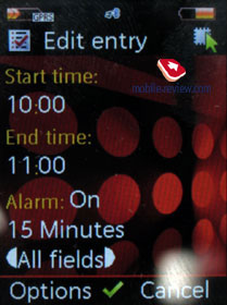 A profile must be created before composing email; otherwise this section will not open. The email client supports SMTP, POP3, IMAP4 protocols. Any file (even those that are not supported by the phone) can be used as attachments. Maximal attachment size should not exceed 10mb. Russian encodings are not supported correctly. Handset’s memory is used for storing e-mail letters, at that you’ll have only around 1 Mb of space, without possibility of turning to memory card, so this function isn’t of much use. There aren’t any preset templates, you should create them yourself. These templates can be used as headings or signature for your message. Settings for voice mail can be found in the same menu. Organizer consists of calendar, voice memos, world time settings and synchronization point. The Calendar is displayed in monthly view by default – all dates which have assigned tasks are shaded. Having selected one of those dates, you will see how the bottom of the screen gets filled up with appointments, which can be instantly browsed. The other view type is weekly one, featuring hourly timetable – one can set start time for any day, choose which days are working ones and which are not. Considering the pleasing fact that all birthdays are automatically directed to the Calendar, the developers provided a function for turning off their appearance on the general list.