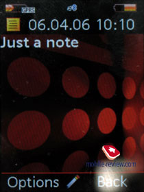 ImpressionsThe reception quality of the device is beyond question, ring tones are heard in almost any environment, while 64 tone polyphony steps aside at the sight of mass MP3 tunes usage. Crackling noises of the loudspeaker are hardly distinguishable in outdoor space, though in indoors areas they appear only in case of badly selected tunes. Pre-set ring tones are of some interest – the device wins some points owing to their splendid sounding (examples may be found in our video clips. Vibration alarm’s strength is above average – on flat surfaces the device is more likely to start moving around. Various profiles allow adjusting the alarm to your own tastes – on the whole this function is materialized very well.