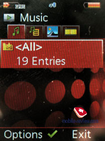 Media player. The general concept of the player is similar to 75-series – to be precise, the media player embedded in the EL71 features four tabs, the first one displays all music files (when uploading new tracks, you better refresh the entire list, as the phone looks for music everywhere), the other tab holds playlists, the third bookmark shows all images, while the last one plays back video clips. The device supports the following formats: MP3, AAC, MIDI, AAC, AAC+, AAC++, AMR-NB, PCM(WAV), SP-MIDI, XMF. As for formats which videos can be stored in – the handset offers both 3GP and mpeg4 with the possibility of setting playback to full-screen mode.