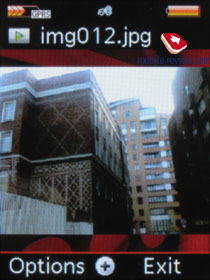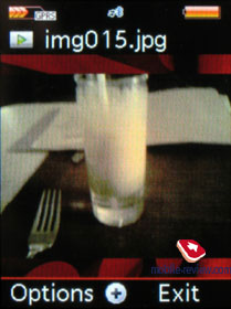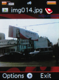 The maximum resolution of a shot is 1280õ1024 pixels at 250-330 Kb per one image. The truth should be told – on the handset’s display all pictures look fine, yet on PC they are of moderate quality, as usual though. The camera is capable of applying 5x digital zoom – when reaching the last scale on the zoom bar, shot’s size decreases to 110-150 Kb with image sharpness going down as well. At maximum resolution you are able to use these special effects: Sepia, gradations of grey, green, orange and purple. As you are decreasing zoom value, the effects pool is extended with Emboss. All taken photos may be saved both in handset’s memory and memory card. White balance has three options to choose from – auto, outdoor and indoor. Night mode and flash setup are also on place. Talking of image resolution, again you will need to guess about them, as the developers have applied labels, that don’t bear much of semantic load – premium (1280õ1024), high (640õ480), medium (320õ240), low (160õ120), wallpaper (132õ176). Pictures, which are aimed at applying to contacts in the phonebook later on are saved in the lowest quality. Resolution may be inspected only via file’s attributes.