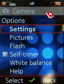 The handset possesses the function of turning off on the schedule. But what is more interesting, when pressing power button while at standby screen, the device offers you either to just switch it off or cancel all alerts and scheduled tasks along with turning off, or simply deactivate all sound alarms without shutting off the device. The same menu houses EDGE and Bluetooth settings. Camera. The handset is equipped with a 1.3 Mpix camera, which is not a satisfactory judging by the current competition level, but this manufacturer has always been well disposed towards incorporating low-resolution camera modules into fashion handsets. The module itself is produced by Samsung, similar to those, Siemens S75 are armed with (the camera is slightly better than that made by OmniVision in the first place).