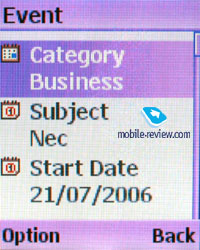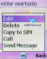There are 1.9mb of memory in the handset and it is dynamically spread over all applications. Memory card is used for storing music, you cannot use it for any other applications. Phone book. Press right soft-key and you will see contact list of your phone book, both handset’s memory and SIM-card entries will be shown at once. Handset offers you the ability o divide contacts into 7 groups (4 of them already have names), each group can have its custom ring tone and image. There can be up to 500 entries in phone book in total. For every entry four phone numbers of any type, office address, home address, company name, position, note and special date (such as birthday, however there is no synchronization with organizer) can be assigned, and don’t forget custom ring tone and image.