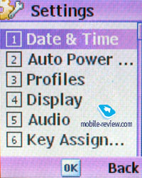 Settings. Auto power on/off function is onboard along with profiles, themes, display settings, wallpaper, key assignment and flight mode.