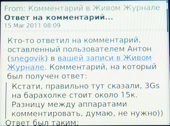 Для меня появление такого продолжения - очень радостное событие, искренне считаю, что это один из самых сбалансированных гаджетов на данный момент. Ну а теперь предоставляю слово Артему, приятного чтения. Blackberry Bold 9780. Немного мыслей об аппарате (Артем Лутфуллин)Наверное, некоторые читатели не приемлют использование слова «любовь», столь серьезного, применительно к «железкам», вероятно, другие будут возмущены появлением на нашем сайте множества материалов по Blackberry, однако оба явления неизбежны. В этой небольшой статье я хочу описать причины, по которым, отобрав у Сережи Кузьмина Blackberry Bold 9780, я влюбился в этот аппарат и забрал его с собой в командировку на MWC 2011 в качестве основного телефона. Без почты, без интернета (потому что Wi-Fi на месте был редко, а пользуюсь я Мегафоном, который пока не работает с сервисами BB), просто как телефон для звонков и текстовых сообщений. В этой статье можно не искать злого умысла и рекламы, хотя ищущий, конечно же, найдет это. Я просто хочу описать те «фишки» и особенности BB, за которые мне так понравился этот аппарат и, вероятно, сама идеология системы и других продуктов компании. Естественно, все мои размышления будут крутиться пока вокруг собственно аппарата и телефонных функций в нем, ибо о большинстве других особенностей я банально не мог составить какие-то впечатления по причинам, описанным выше. «Железка»Смотрим стоимость BB 9780 в Яндекс Маркете, в среднем 16 000-18 000 рублей. Дорого, учитывая, что перед нами 1) не имиджевый телефон и 2) не смартфон. Затем смотрим на сам телефон, чувствуем, как он лежит в руке. Лично у меня такие же чувства в последний раз вызывала Nokia E71, я не учитываю здесь вещи вроде Nokia 8800 или Vertu. То есть, чувство качественной вещи в руке, хорошо собранной, из недешевых материалов. Странно, ведь сегодня и кроме BB есть аппараты из дорогих материалов и с качественной сборкой, но такого впечатления, как 9780, они у меня не оставляли, а он – оставляет. ![]() ![]() ![]() ![]() По большому счету, в материалах корпуса Blackberry 9780 нет ничего особенного, глянцевая рамка по периметру лицевой стороны, пластиковые клавиши, крышка аккумулятора из прорезиненного пластика, матовый пластик вокруг крышки и глянцевая «верхушка» аппарата. Но сочетание всех этих вариантов пластика и их пропорция вместе с дизайном аппарата создают то самое ощущение добротной вещи. По крайней мере, у меня. ![]() ![]() ![]() ![]() ![]() ЭкранПо современным меркам, экран в BB 9780 устарел. Во-первых, он не сенсорный, во-вторых, с низким разрешением 480x360 точек, в-третьих, дисплей ландшафтно-ориентированный. Несмотря на все это, экран в телефоне оставляет только приятные впечатления. Своим сносным поведением на ярком солнце, а информация в таких условиях на дисплее остается читаемой. Своей спокойной яркостью и цветопередачей. А главное – как приятно говорить по телефону с несенсорным дисплеем, не боясь случайного включения экрана и того, что вы вот-вот надавите ухом на кнопку отбоя звонка. МелодииЯ уже очень давно так не удивлялся базовому набору мелодий в телефоне, как удивлялся этому моменту в BB. Особенно это касается мелодий для будильника. Вначале идет какой-то легкий неспешный мотив, затем вы начинаете слышать в мелодии едва заметный посторонний повторяющийся звук, который постепенно выходит на первый план. При этом сама мелодия заглушается, и вот уже на 10-15 се