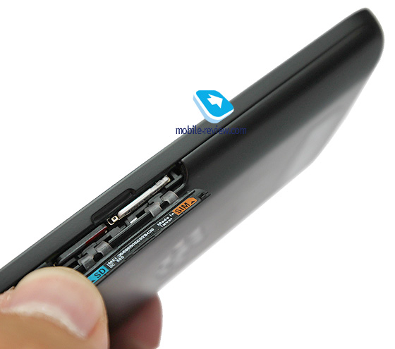 На левой боковой стороне находится microUSB разъем. Светодиодный индикатор вынесли на лицевую поверхность, он справа от решетки динамика. Есть датчик приближения, фронтальная камера, она 2-мегапиксельная. На правой боковой стороне - две клавиши регулировки уровня звука, и посерединке — кнопка, отвечающая за разные действия в зависимости от меню, также ее можно настроить на свои действия. В отличие от Q10, в этой модели корпус монолитный, невозможно сменить аккумулятор, а разъем для microSIM, а также карт памяти microSD, вынесли на левую боковую сторону. За откидывающейся шторкой, прикрепленной к корпусу, вы найдете эти разъемы. Конструкция не идеальная, но при аккуратном обращении и нечастой смене карт ее должно хватить надолго.