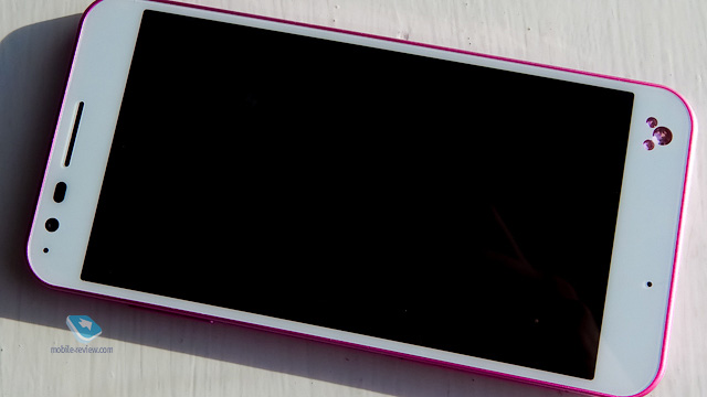 Спереди над экраном расположился разговорный динамик, а слева от него – датчики приближения/освещения, фронтальная камера и вышеупомянутый световой индикатор. Под экраном, кроме головы Микки Мауса, есть только основной разговорный микрофон, а стандартные кнопки Android в этом смартфоне выполнены в наэкранном формате. Сама матрица прикрыта стеклом Gorilla Glass (производитель не указывает поколение стекла) с довольно слабым олеофобным покрытием – палец по стеклу скользит хорошо, но вот отпечатки с него удаляются с трудом.