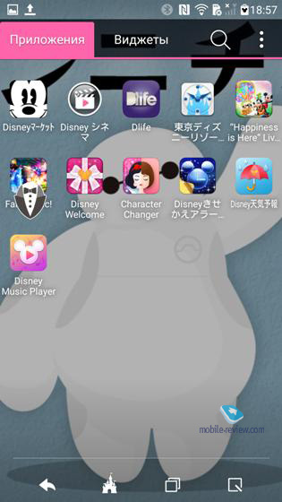 Многие тематические добавления/изменения уже затрагивались в этом обзоре, поэтому пробегусь по тем, о которых еще не упомянул. В первую очередь стоит упомянуть, что все смартфоны Disney Mobile не просто оформлены в соответствующем стиле, они, грубо говоря, завязаны на диснеевских сервисах. То есть, помимо привычных аккаунтов Google и Docomo, которые можно настроить во всех устройствах оператора, здесь еще есть и Disney MyID, предназначенный для использования встроенных диснеевских сервисов, например, магазина приложений, контента и тем оформления. Поспешу расстроить всех фанатов Уолта Диснея, ибо практически все присутствующие сервисы работают только на японском языке, что очень осложняет возможность их использования. По сути, серия Disney Mobile – это что-то вроде виртуального оператора на базе NTT Docomo со своими тарифами, поэтому его приложения рассчитаны только на японцев, и даже со знанием японского языка вы не сможете полноценно пользоваться этими “плюшками” – почти во всех случаях устройство уведомит о том, что оно не обнаружило сим-карту Docomo и поэтому не сможет открыть определенный сервис.