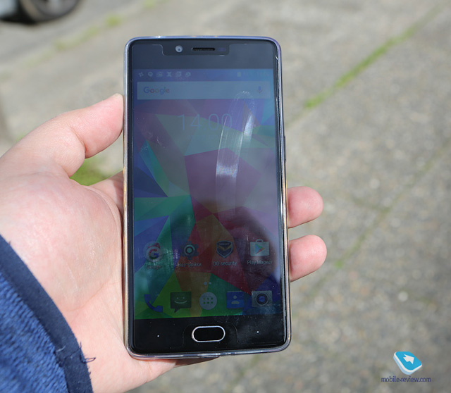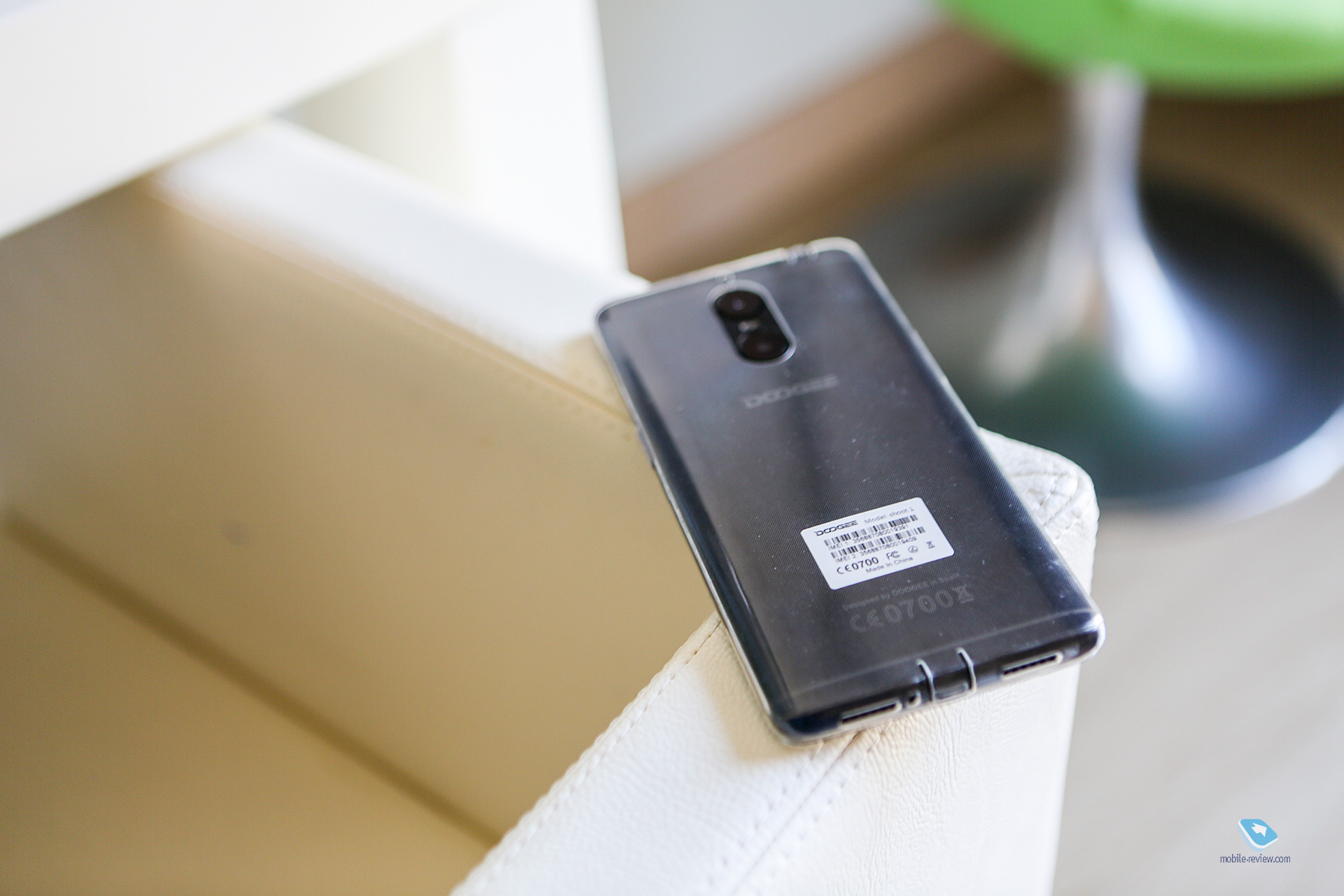 Лицевая панель обычная, стекло 2.5D, наклеена защитная пленка, она быстро собирает царапины и отпечатки пальцев, как и многие подобные пленки из комплекта поставки. К слову сказать, в комплект также входит защитный силиконовый чехол, его необычность заключается в том, что в нем есть заглушки для microUSB-разъема и выхода 3.5 мм, но никакой защиты от влаги чехол, конечно же, не обеспечивает. Наличие таких заглушек многим покажется излишним, я на своем аппарате их аккуратно отрезал за ненадобностью. В чехле аппарат становится чуть больше, и сторонние зарядки могут не доставать до разъема microUSB или выпадать из него. Но кроме этого огреха, никаких проблем нет, а чехол вполне симпатичен.