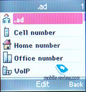 МенюГлавное меню представлено матрицей из 12 иконок, одновременно на экране помещается девять из них. Все подменю имеют горизонтальные списки, некоторые опции редактируются через левую софтверную клавишу. Навигация по меню сделана без особых изысков. При перемещении по меню при помощи навигационной клавиши выбранный пункт подсвечивается, реализована цикличная прокрутка списков. ![]() Телефонная книгаДля показа списка всех контактов из режима ожидания нужно нажать правую софт-клавишу и строку поиска. Сам поиск существует лишь фигурально – при вводе буквенной последовательности найденные соответствия сразу не отображаются. При создании контакта сразу нужно указать место сохранения – в памяти телефона или на SIM-карте. Поле имени одно, ввести в него можно 20 знаков с учетом пробелов. Для каждого контакта доступна запись мобильного, домашнего, офисного и VoIP-телефона. Для каждого типа имеется своя иконка. Кроме этого, можно заполнить поле электронного и домашнего адреса. Для каждого контакта можно установить собственную мелодию и фотографию. При входящем вызове фотография показывается в виде маленькой иконки в нижней части экрана. Поддерживаются группы, их общее количество не может превышать 20. Для группы можно установить общую мелодию для входящих звонков и сообщений, но если для контакта, входящего в группу, установлена индивидуальная мелодия, то она имеет приоритет. В окне группы указывается ее название, мелодия звонка, мелодия сообщений и численность группы. При открытии этого пункта выводится поименный список группы. Емкость телефонной книги составляет 500 имен, это число не зависит от количества полей, заполненных для каждого контакта. Для любого заполненного телефонного поля можно выбрать тип звонка вызова – GSM или WLAN. В списке быстрого набора может быть до 8 имен. Быстрый набор можно назначить и на определенный номер имени. В пункте меню «Мой номер» отображается информация о номере, зарегистрированном в сети для этого телефона. Корректно отображается зарегистрированный на сервере SIP ID, а вот номер при нахождении в роуминге телефон определять не умеет.