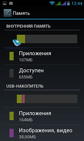 В наличии Bluetooth версии 4.0 (EDR/A2DP) для передачи файлов и речи. С подключением гарнитур никаких проблем не было: коннектится быстро, а речь передается относительно чисто. Присутствует беспроводная связь Wi-Fi IEEE 802.11 b/g/n. Аппарат, естественно, может быть задействован в качестве точки доступа (Wi-Fi Hotspot) или модема. В настройках этот пункт значится как «Режим модем». Для передачи файлов и синхронизации данных используется USB 2.0 (High-Speed). При подключении «Эксплея» к ПК он определяется как USB-Flash-устройство или USB-модем. Память и карта памятиСмартфон снабжен 512 МБ оперативной памяти. В настоящее время это количество не самое большое, естественно, хотелось бы 1 ГБ. В среднем, свободно достаточно много «оперативки» - около 240 МБ. Но, как ни странно, даже при таком количестве аппарат абсолютно не тормозит.