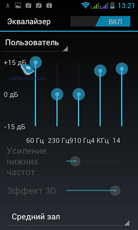 ![]() МультимедиаМузыкальный проигрыватель. Обычный музыкальный плеер со звуковыми эффектами Android 4.0. Лучше всего воспользоваться сторонним плеером типа PowerAMP.Там и настроек больше, и звук качественней.
