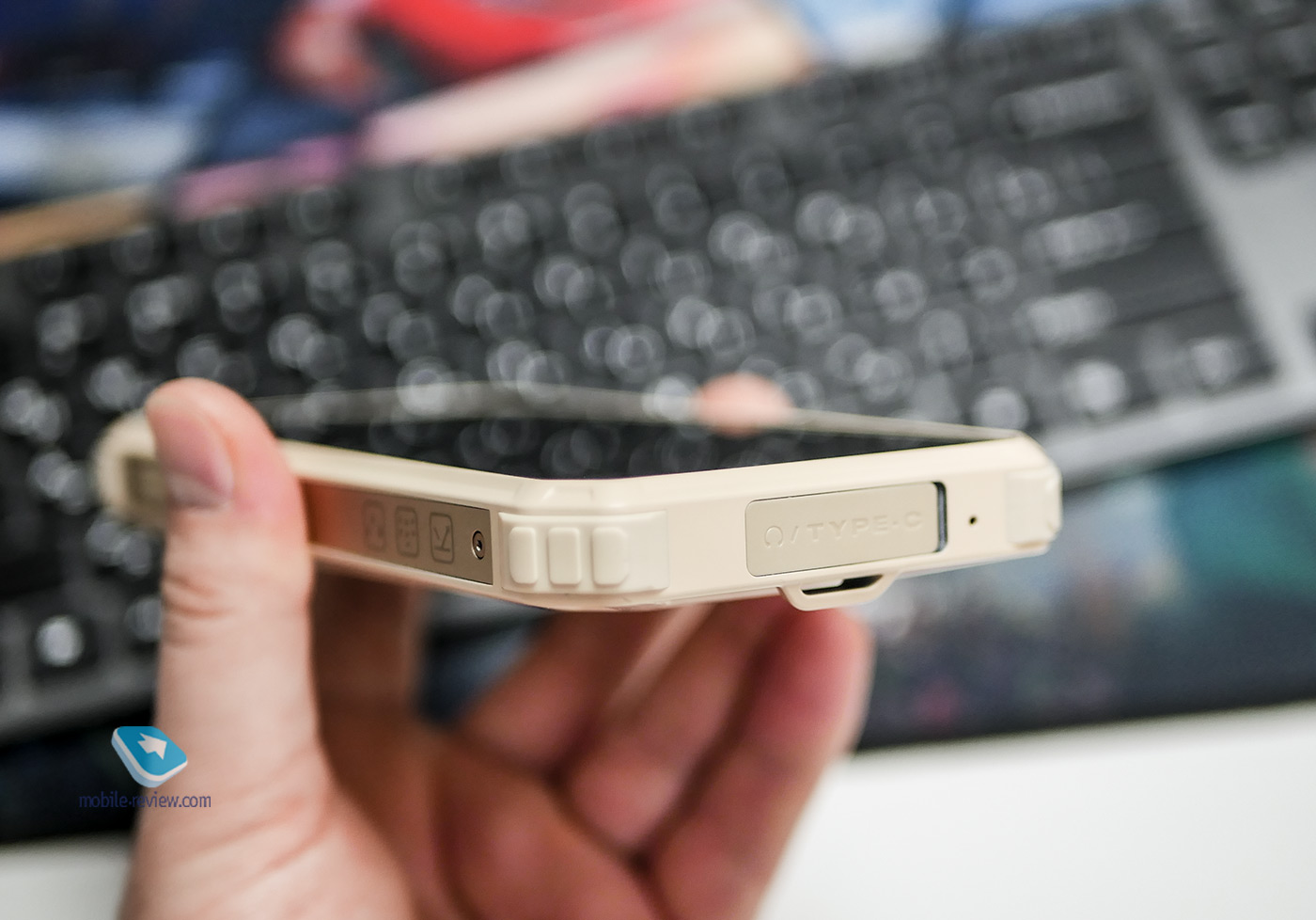 Кстати, моя супруга часто роняет или топит смартфоны. Благо у нее LG G6, который выдерживает все испытания. Но B2021 она бы не стала пользоваться – слишком большой и тяжелый. Корпус F150 скроен по типу большинства аналогичных защищенных устройств: прочный пластик и много металла, усиленные углы и толстенные рамки, а также резиновые заглушки на разъемах. К весу устройства надо быть готовым – 320 граммов. Это на 100 г тяжелее Samsung Galaxy S21 Ultra. Впрочем, меня это совершенно не смущало. Наверное, потому, что сейчас зима и гаджеты я в основном ношу в больших карманах массивной куртки. В жаркое время года даже и не знаю, как народ будет таскать этот брусок из пластика, металла и резины. Хотя могу предположить, что он для тех, кто занимается экстремальными видами спорта или работает в условиях, где есть риск повредить телефон. И те и другие будут хранить смартфон в каком-нибудь рюкзаке или сумке. Кнопки и разъемыНа правом торце F150 B2021 расположены следующие элементы: