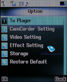 Видео снимается только в одном разрешении – 176х144. Возможно выбрать качество видео и установить запись со звуком или без. Также возможно выбрать формат, в котором будет производиться запись: MPEG4 или H.263. Судить о качестве видео довольно сложно, на экране телефона ролики смотрятся неплохо, при переносе на ПК также каких-либо притормаживаний не заметно, но уж слишком маленькое разрешение. Пример видео (3gp, 100 кб) >>>