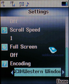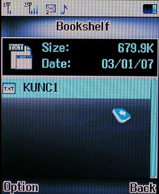 Электронные книги. Это простая читалка электронных книг. Поддерживаются три кодировки: ASCII (Western Windows), UCS2 (Unicode) и UTF8. В настройках возможно установить шрифт (обычный, курсив или жирный), выбрать его размер (маленький, средний или большой), выбрать прокрутку (постранично или построчно), а также включить автопрокрутку. Аппарат без проблем открывает файлы объемом 1 Мб, тратя на это действие не более 10 секунд. Читать книги с небольшого дисплея, честно сказать, не очень-то и удобно, хотя, возможно, кому-то такая возможность и пригодится, например, чтобы скоротать время в поездке.