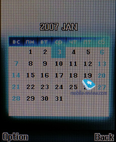![]() Органайзер. В календаре возможен просмотр только за месяц. Кроме этого, можно посмотреть список всех событий. Для события устанавливается дата и время (начало и окончание события), небольшая текстовая заметка (до 35 символов), звуковое оповещение с возможностью выставить повтор: ежедневно, еженедельно, ежемесячно или по выбранным дням недели. В примечания можно добавить один уже готовый шаблон напоминания (всего их в памяти телефона 10). Все события можно переслать в формате vCalendar через SMS, MMS или Bluetooth.